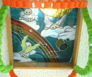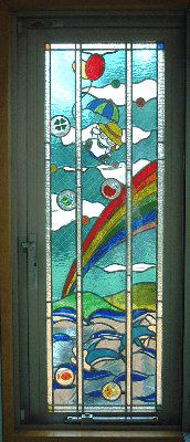フュージング(ステンドのガラスを窯の中で焼成します。)を所々に使っています。右の天窓のデザインは「な・な・なんと!」うちの奥さんのデザインです。