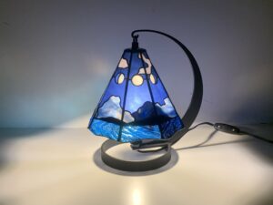 「月の満ち欠け」このランプ、削りがとっても大変。制作工程はこちらでご覧になれます。もう最後かな、と言いつつ結構作りましたね。7?8個目?最初に使ったガラスは一部なくなってしまったけれど、今回の作品はこれです。