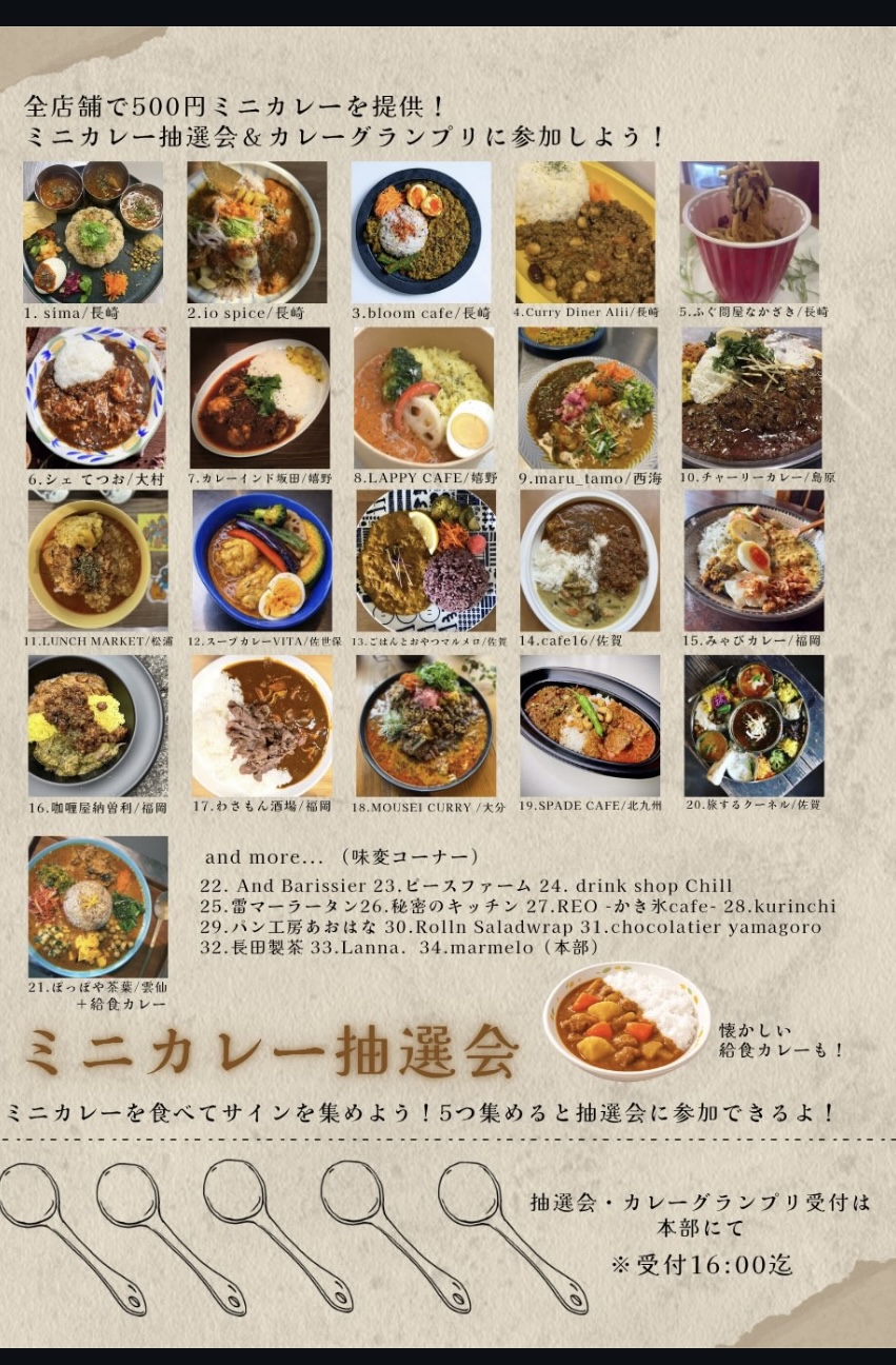 4月5日(日)11:00~16:00 長崎県庁横おのうえの丘 ー入場無料ー 21店舗が参加来場者にはスプーンが手渡され一番おいしいと思ったお店に返却して、フェスの最後にスプーンの重さをはかって一番重かったお店がグランプリ!会場では一食500円て提供されます。大人数で行くといろんな味を楽しめそうですね(^^♪